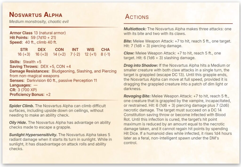 The Shadow Seekers The Nosvartus are diseased or corrupted humanoid entities that dwell in a state of perpetual twilight. Once rational beings who participated in the Great Pact, they have largely succumbed to a vampiric hunger for living flesh and sanity. They are distinguished by their mottled, oily black and sickly gray skin stretched over streamlined bones and possess rows of needle-sharp teeth. They are notorious mimics, capable of reproducing the cries of human infants or wounded allies to lure victims into the dark. Their greatest weakness is Sunlight Hypersensitivity; they are physically burned by true sunlight and forced to retreat to deep caves and shadowed valleys.